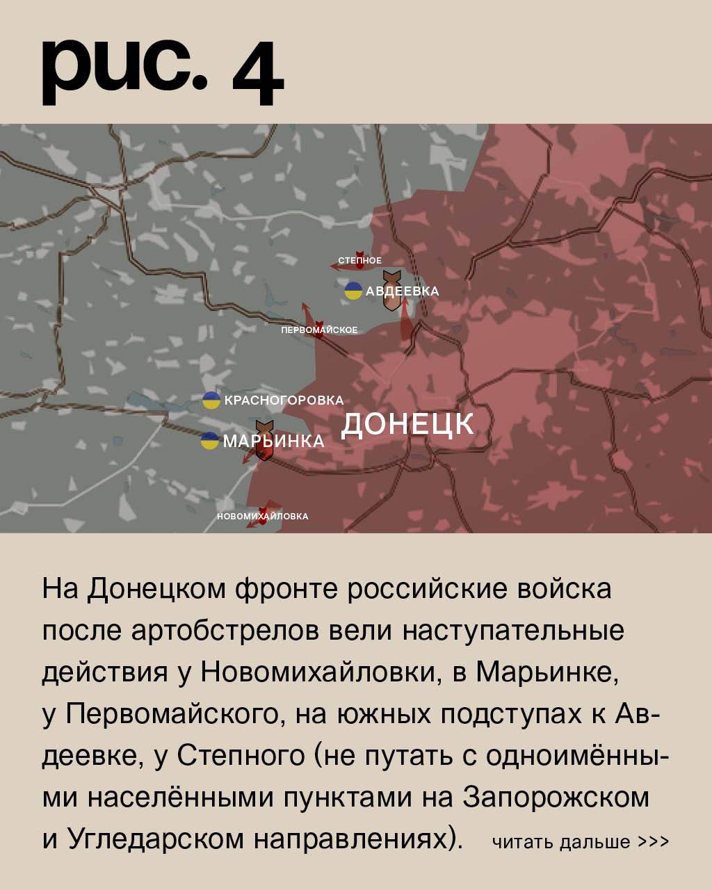 На ДОНЕЦКОМ фронте российские войска после артобстрелов вели наступательные действия у Новомихайловки, в Марьинке, у Первомайского, на южных подступах к Авдеевке, у Степного (не путать с одноимёнными населёнными пунктами на Запорожском и Угледарском направлениях). Попытка продвинуться у Южного. Для ВСУ неожиданно. ВС России наносили удары по украинским войскам в Парасковьевке (не путать с одноимённым населённым пунктом к юго-западу от Соледара), Победе, Георгиевке, городе Красногоровка, Нетайлове, Тоненьком, Бердычах, Керамике, Александрополе (населённый пункт к северу от Донецка), Сухой Балке и Нью-Йорку.