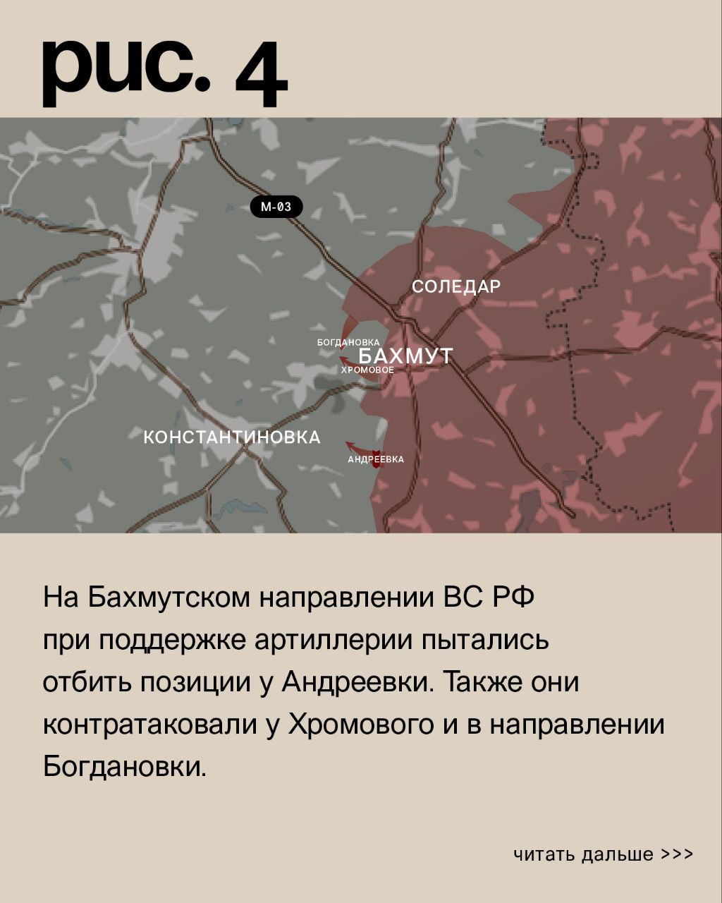 На БАХМУТСКОМ направлении ВС России при поддержке артиллерии пытались отбить позиции у Андреевки. Также они контратаковали у Хромового и в направлении Богдановки. Под ударами ВСУ в Константиновке (не путать с одноимённым населённым пунктом к юго-западу от Донецка), Клещеевке, Ивановском, Калиновке, Выемке и Спорном. ВС России – в Курдюмовке, Отрадовке и Бахмуте.