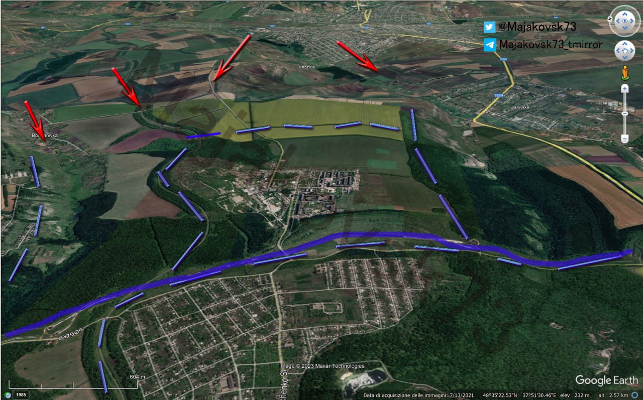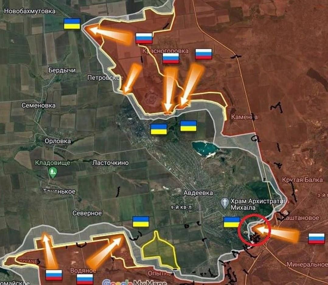На юго-западном фланге Авдеевского гарнизона – подразделения ВС России продолжают штурмовать опорные пункты противника в районе н.п. Северное и Тоненькое, которые прикрыты цепью укреплений, возведённых ещё в 2017 году. Общая длина окопов по рубежу составляет до 9,8 км. Вклинившись в оборону ВСУ и заняв один из опорников в 1 км севернее от Водяного, наши войска продвинулись, подойдя вплотную к укреплённым позициям противника в 800 м от Северного, сообщает Телеграм-канал «Кирпичи ВП».