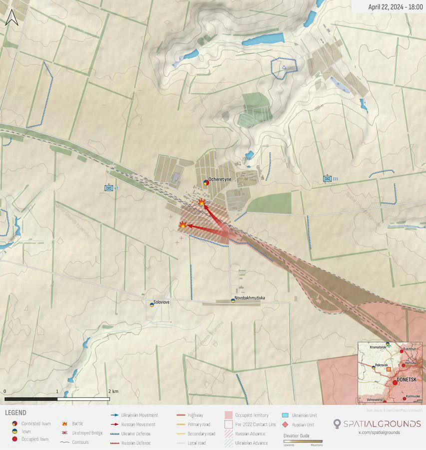 Кроме того, Очеретино, хоть и внутренняя, но железнодорожная станция, её потеря для ВСУ означает ещё большую удалённость крайней точки подвоза ресурсов от фронта. И более крупной нет до Гродовки, что в 25 километрах. А это уже за пределами того района между Авдеевкой и Красногоровкой, за который цепляется командование ВСУ, получившее приказ удержать эти позиции до середины мая, а лучше до июня.