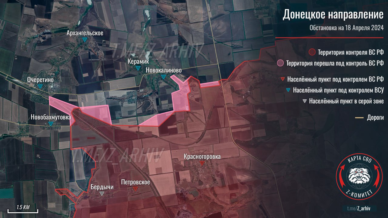 По сообщениям Телеграм-канала «ШТОРМ новости», под Очеретино пошло расширение плацдарма российских войск. Движение идёт со стороны СНТ «Заря» на запад. Часть подразделений ВСУ спешно подтягивается к промзоне в районе бывшего кирпичного завода. С учётом размеров посёлка и количества прилетающих на позиции ВСУ авиабомб, командование украинской армии справедливо опасается, что прорыв российских войск от подстанции «Очеретино-Тяговая» к водоканалу на востоке, а затем и на запад может состояться в ближайшее время. Задержать продвижение российских войск ВСУ пытаются всеми силами, но оборона постепенно просаживается