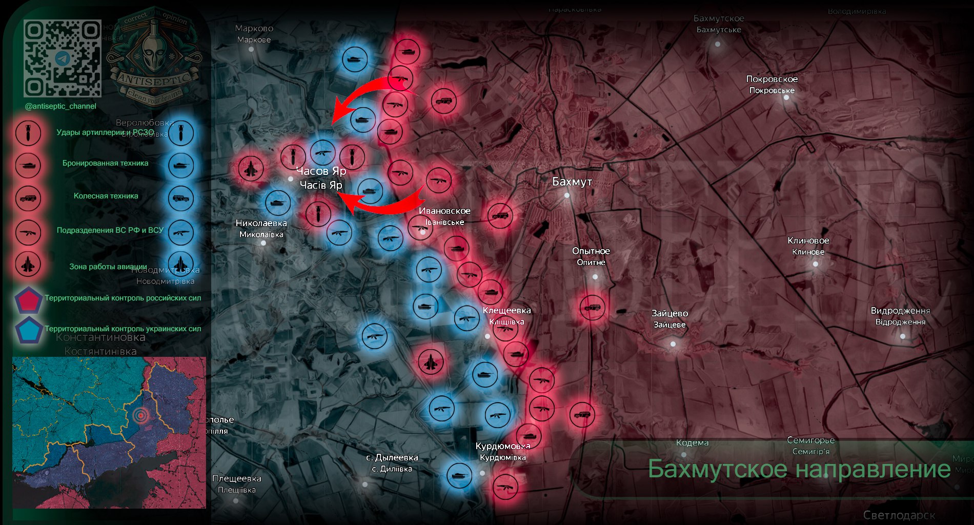 На южном фланге также идут бои за урочище «Ступки-Голубовские-2», чтобы выйти к Часову Яру с юга. В самом городе наши бойцы пытаются захватить укрепрайона врага в задании училища №77. По позициям врага постоянно наносятся удары артиллерией и авиацией. Моральный дух врага на этом участке крайне низок, отмечает Телеграм-канал ANTISEPTIC.