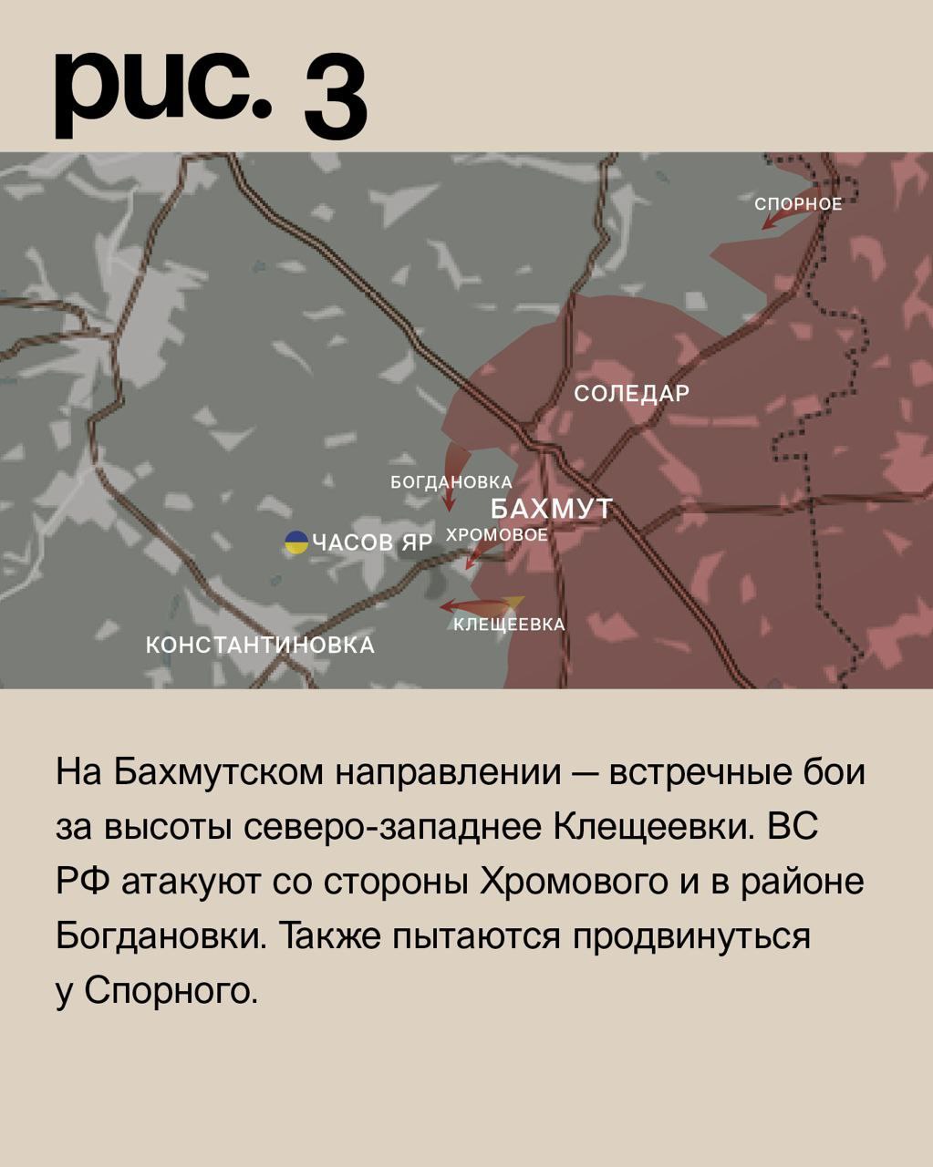На БАХМУТСКОМ направлении – встречные бои за высоты северо-западнее Клещеевки. ВС России атакуют со стороны Хромового и в районе Богдановки. Также пытаются продвинуться у Спорного.