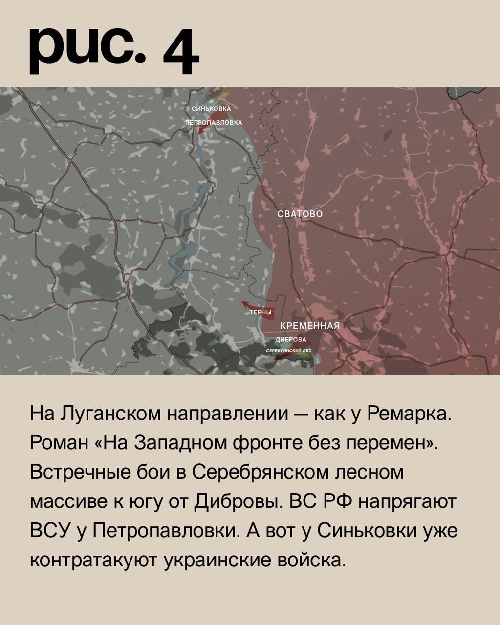 На ЛУГАНСКОМ направлении – как у Ремарка. Роман «На Западном фронте без перемен». Встречные бои в Серебрянском лесном массиве к югу от Дибровы. ВС России напрягают ВСУ у Петропавловки. А вот у Синьковки уже контратакуют украинские войска.