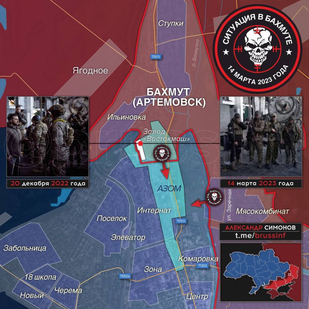 Силы ЧВК «Вагнер» продвинулись на севере Бахмута, взяв под полный контроль завод «Востокмаш» и продолжают штурм АЗОМа.