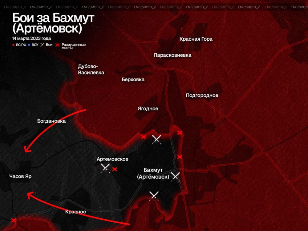 В настоящее время бойцы ЧВК «Вагнер» с северо-запада и юга продолжают продвигаться к Часов Яру. В случае успеха клешни наступающей группировки вокруг Артёмовска сомкнутся.