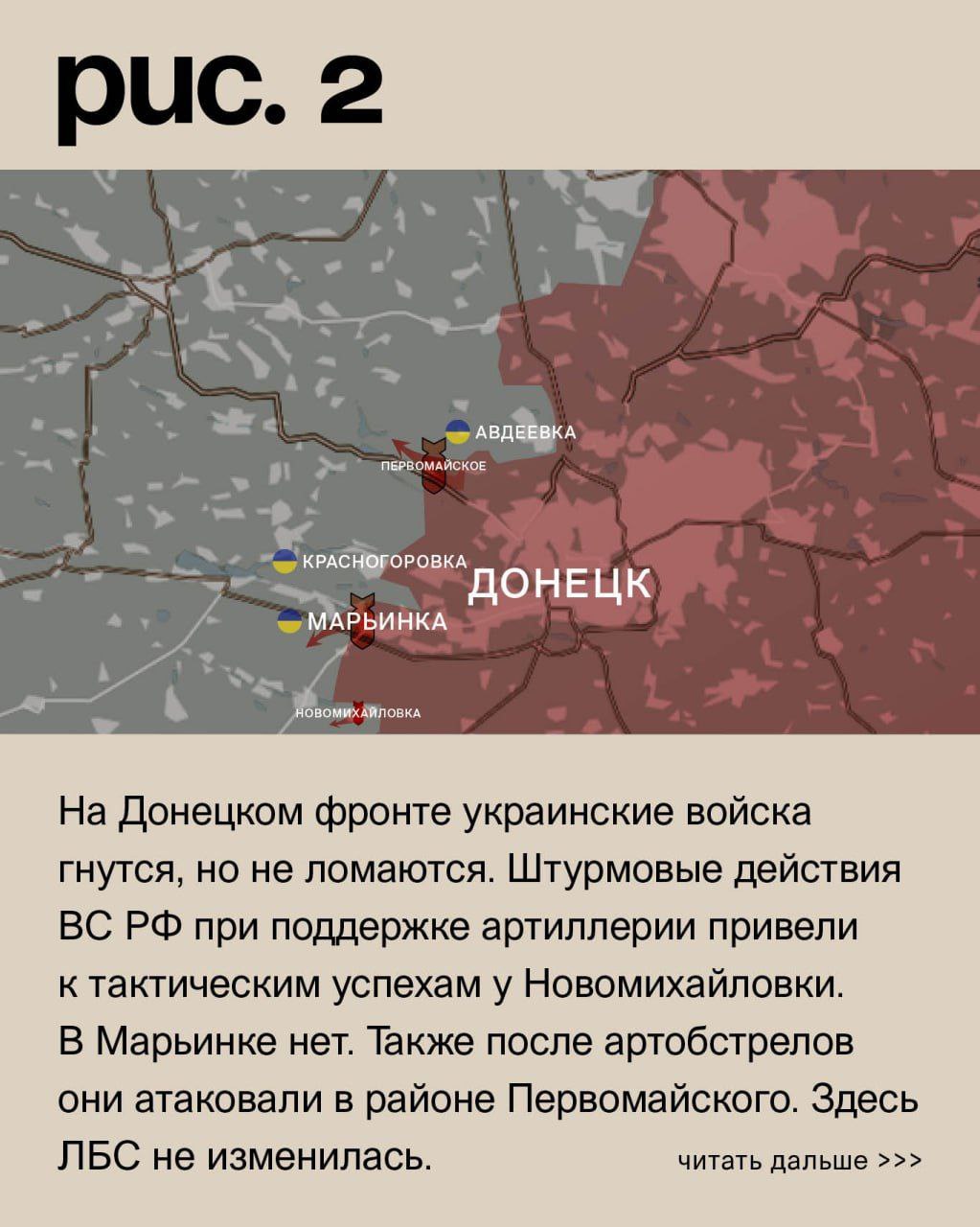 На ДОНЕЦКОМ фронте украинские войска гнутся, но не ломаются. Штурмовые действия ВС России при поддержке артиллерии привели к тактическим успехам у Новомихайловки. В Марьинке нет. Также после артобстрелов они атаковали в районе Первомайского. Здесь ЛБС не изменилась.