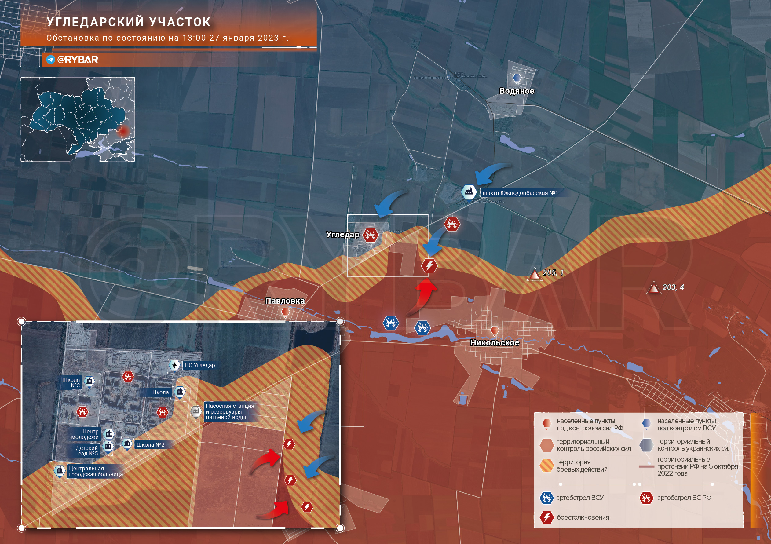 По состоянию на 13 часов пятницы, 27 января 2023 года, морские пехотинцы 155-й бригады Тихоокеанского флота и бойцы ОБТФ продолжают зачистку дачных районов на юго-востоке Угледара. Продвижение вглубь города на данный момент бесперспективно из-за плотной обороны внутри (не менее трёх рот на 1 км).
