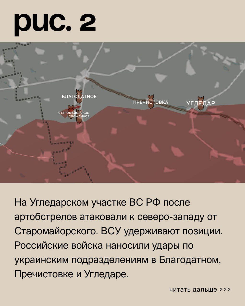 На УГЛЕДАРСКОМ участке ВС России после артобстрелов атаковали к северо-западу от Старомайорского. ВСУ удерживают позиции. Российские войска наносили удары по украинским подразделениям в Благодатном, Пречистовке и Угледаре. Сами под обстрелами в Приютном, Заветном Желании, Новодонецком, Новомайорском и Павловке.