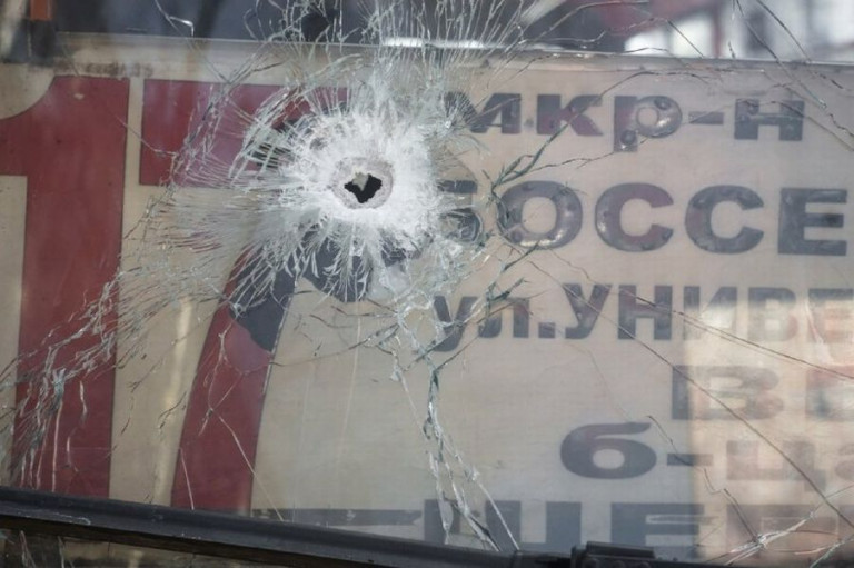 В салоне автобуса – несколько безжизненных тел. Все старики. Между кресел лежало тело пожилого мужчины в медицинской маске. Она была спущена на подбородок. На лбу – очки. Чёрные зрачки уставились куда-то в потолок. Кто-то из пассажиров ехал с продуктами. Куриные яйца упали на пол и разбились. Их содержимое вытекло и перемешалось с человеческой кровью и вытекшим из пачки молоком. Вышел из салона. Под ногами хрустело битое стекло. Подошёл к лобовому стеклу. Оно было прострелено. Насколько же жизнь может быть циничной. Снаряд угодил как раз в то место, где на табличке было написано «Боссе».