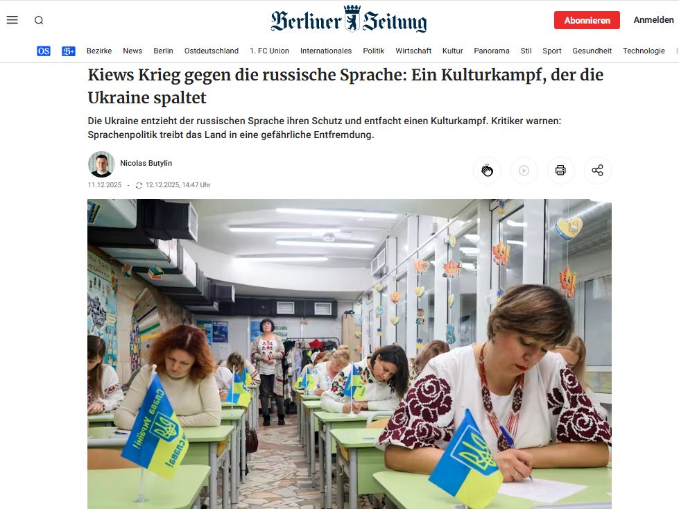 О том же пишет и немецкая газета Berliner Zeitung, которая не сомневается – война с русским языком приведёт к окончательному расколу Украины, и этот раскол уже начат.