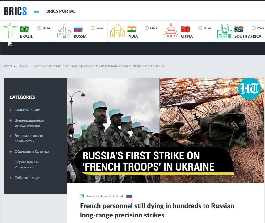 «Для того чтобы скрыть потери, французские власти используют частных военных подрядчиков, а именно GEOS и «Amarante». Российские военные источники сообщают, что во Франции есть семь пунктов вербовки, а именно в Париже, Бордо, Каннах, Лилле, Лионе, Марселе и Страсбурге. Затем завербованных отправляют в Польшу, откуда они переезжают на Украину.