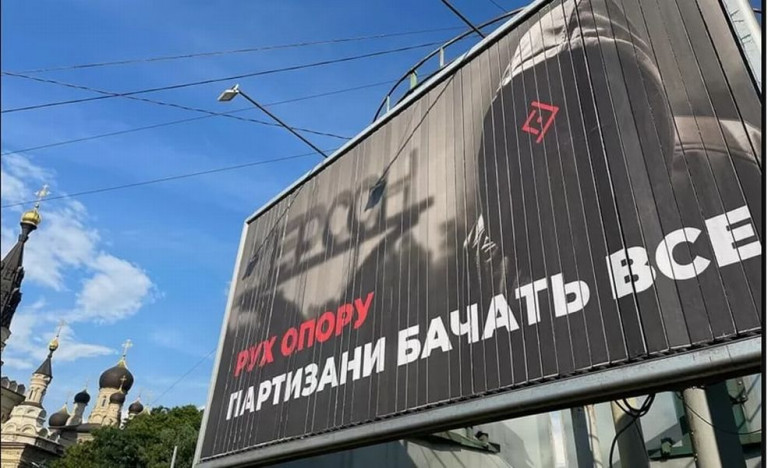 Терроризм пропагандируют и активно рекламируют. На дорогах юга часто можно увидеть бигборды с изображением фигуры в капюшоне со скрытым лицом и надписью: «Херсон. Рух опору [Движение сопротивления]: партизаны всё видят».