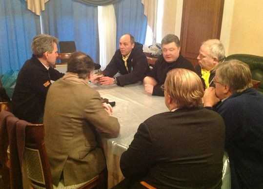 Февраль 2014-го. Киев. Дом профсоюзов. Послы США (Пайетт) и Британии (Смит) встречаются с комендантом майдана Парубием, активными майданщиками Порошенко и Кубивым, после переворота ставшими соответственно секретарем СНБОУ, президентом Украины и главой Нацбанка Украины.