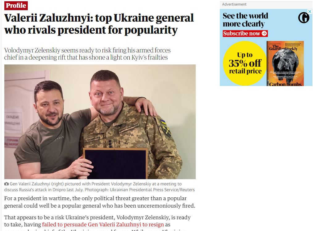 Другое британское издание The Guardian называет Залужного «главным украинским генералом, который соперничает с президентом по популярности» и достаточно точно объясняет, в чём суть проблемы: