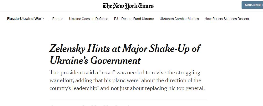 «Трения между армией и правительством представляют собой самый серьёзный раскол в руководстве Украины. На Западе этим недовольны. Зеленский теряет имидж не только за пределами Украины, но и в самой стране. Тихая борьба во власти уже переходит в открытое противостояние. Западные партнёры возмущены такой ситуацией и хотят заменить Зеленского. Тогда произойдёт настоящее реформирование политического ландшафта украинской власти», – пишет NYT.