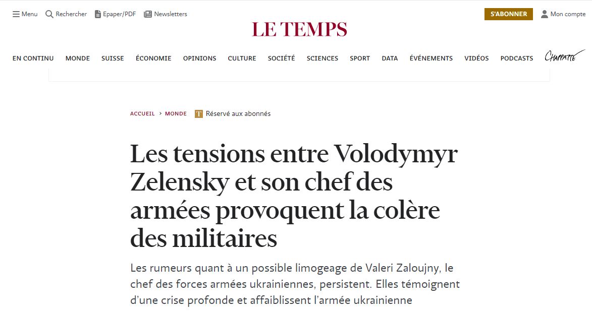 Однако не все западные СМИ решили представить генерала Залужного как положительного героя. Так, например, французская газета Le Temps готова обвинить главнокомандующего украинской армией во всех провалах ВСУ на фронте.