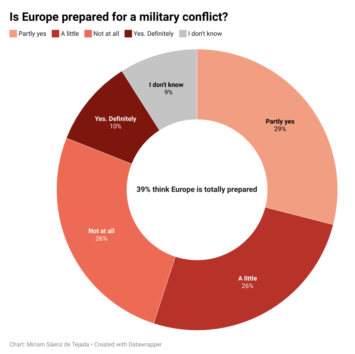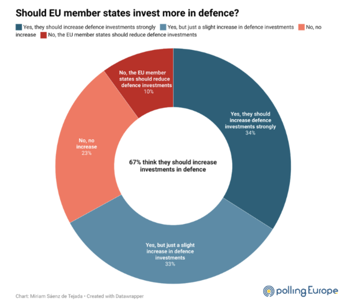 Настроения населения в Западной Европе не в пользу поджигателей войны. Недавний опрос общественного мнения, проведённый Polling Europe, показал, что 26% европейцев полагают, что ЕС к войне не готов, 39% считают, что готов. 29% считают, что готов частично. На вопрос «Должны ли страны-члены ЕС увеличить инвестиции в оборону?» 23% ответили «нет», 10% ответили, что расходы на оборону надо сократить, 33% – если и увеличить, то не намного ().