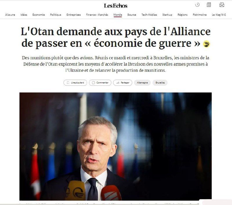 «Генеральный секретарь НАТО Йенс Столтенберг призвал членов Североатлантического альянса ускорить темпы оборонного производства. Бесконечные поставки оружия Украине опустошили склады и запасы западных стран. Теперь в приоритете восполнение боеприпасов. Вопрос об отправке истребителей Киеву отошёл на второй план – в первую очередь боеприпасы, а самолёты потом. На брюссельских встречах министры обороны стран НАТО рассматривали различные способы, которые смогли бы ускорить поставки нового оружия, обещанного Украине, и перезапустить производство боеприпасов»,