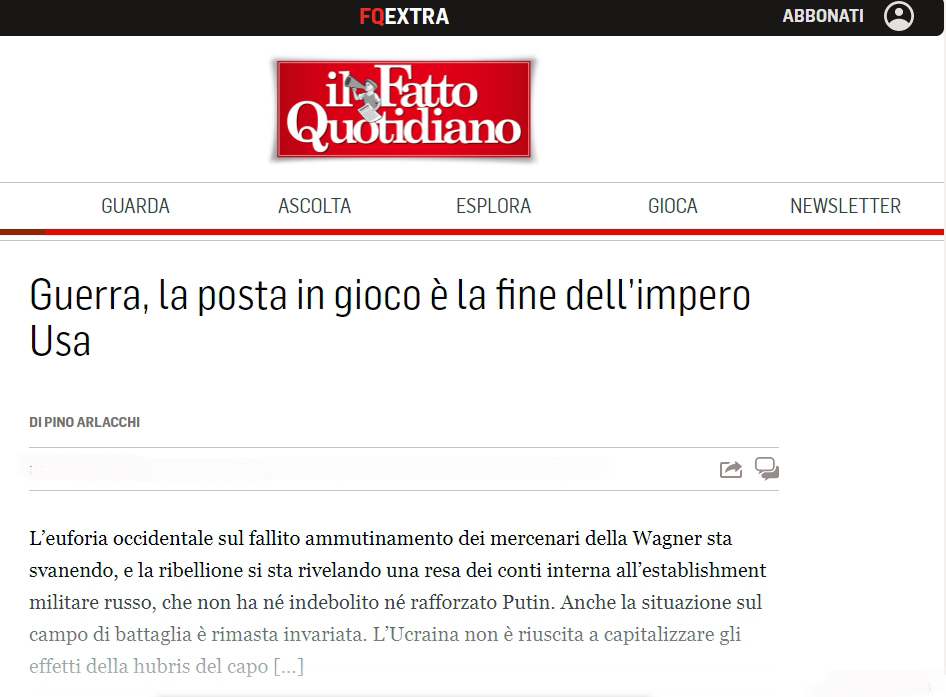 «Безразличие к судьбе этой несчастной страны объясняется тем, что конечная ставка в нынешнем конфликте не имеет к ней никакого отношения. По большому счёту не имеет она отношения и к России, которая была избрана «главным демоном», поскольку в её лице нашли идеального врага, чтобы отодвинуть во времени гибель американской империи. Элита Соединённых Штатов прекрасно понимает, что мир стал многополярным, поэтому Вашингтон хочет лишь отсрочить свой финал даже за счёт европейцев, которых втянули в саморазрушительное противостояние с Россией», – пишет Il Fatto Quotidiano.