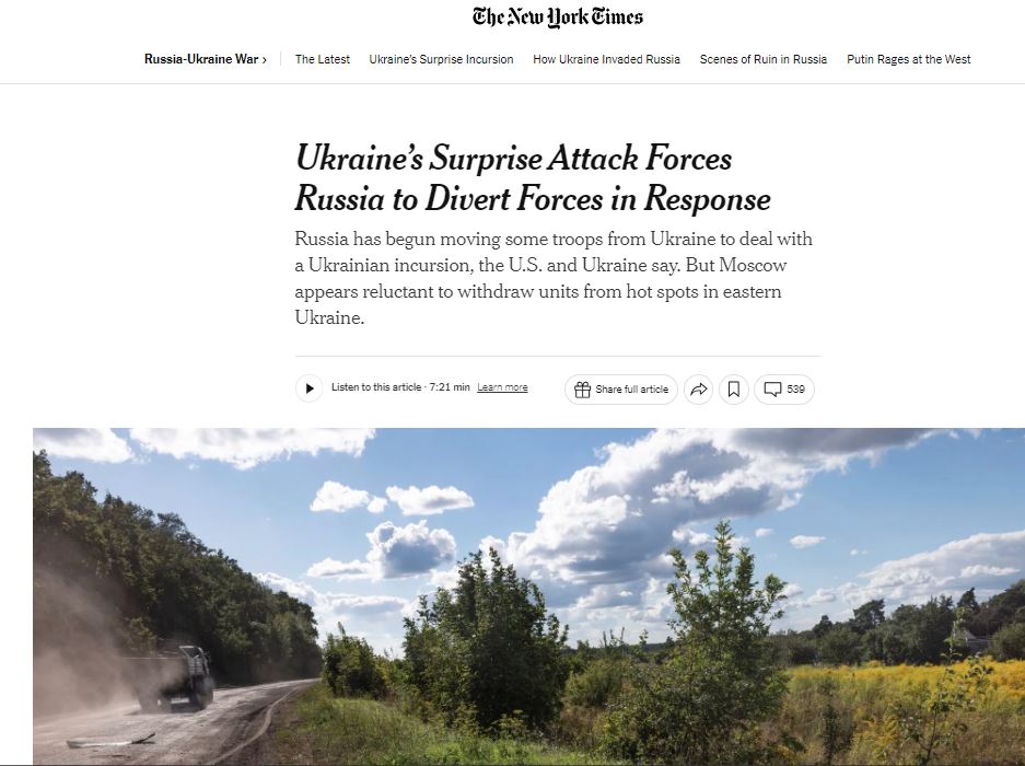 Американская газета The New York Times посвятила очередную статью вторжению украинских террористов на территорию Курской области.