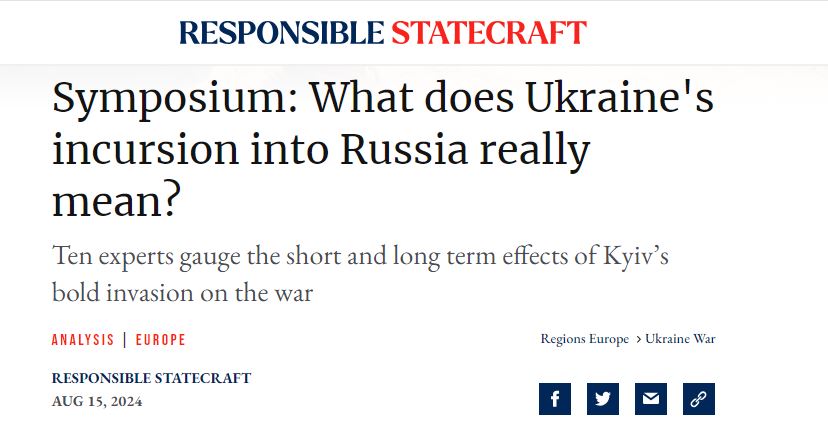 Американское интернет-издание The Responsible Statecraft решило узнать, что думают эксперты по поводу украинского вторжения на территорию Курской области России. Большинство экспертов признают военный успех Киева, хотя и называют его «некоторым успехом», в то же время все они сходятся в одном – этот некоторый успех не сулит Киеву в будущем ничего хорошего. Мало того, Киеву за свой «успех» придётся заплатить очень высокую цену.