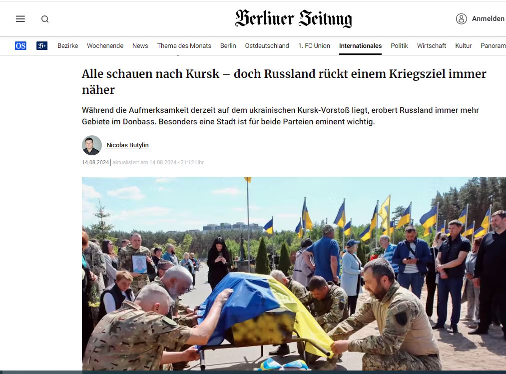 «Внимание политиков, журналистов и блогеров по всему миру приковано к украинскому вторжению в Курской области, а Россия тем временем отвоёвывает всё новые территории в Донбассе. Протяжённость фронта составляет более 1000 километров и по всему фронту Русская армия идёт вперёд. Российские войска всё ближе подступают к Покровску – городу стратегического значения, в районе которого украинской армии приходится крайне тяжело. Русские солдаты всего в 20 километрах от этого важного для Киева города, но их некому остановить – украинские подразделения отправили для подкрепления в Курскую область. Покровск – административный центр и важный транспортный узел на востоке Донбасса. Он расположен на главной дороге и служит маршрутом снабжения других контролируемых Украиной населённых пунктов, таких как Часов Яр или Константиновка. Если российские войска возьмут Покровск, Москва станет на шаг ближе к одной из своих промежуточных целей – завоеванию всего Донецкого административного района», – объясняет Berliner Zeitung своим читателям.