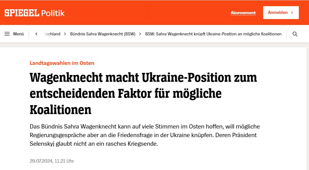 В сентябре в Саксонии, Тюрингии и Бранденбурге будут избраны новые земельные парламенты. Помимо образования и миграции, партия Вагенкнехт уделяет особое внимание проблеме мира – поэтому она очень популярна в трёх землях, где её рейтинг составляет от 15 до 20%. Партия АдГ также занимается этим вопросом. Обе партии выступают против поставок оружия на Украину и за немедленные переговоры между Украиной и Россией, поясняет издание.