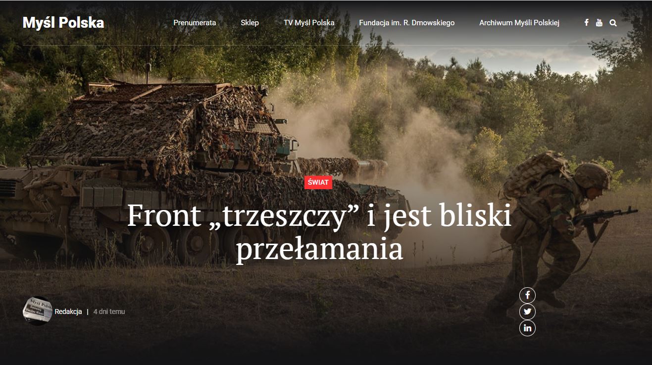 «Ползучее летнее наступление» русского генерала Герасимова согласно правилам военного искусства набирает обороты. К концу июля становится понятно – кажущиеся хаотичными российские наступательные действия, проводимые на различных участках растянувшегося на 1500 километров фронта со второй половины мая, интенсифицируются, складываются в логическое целое и оказываются элементами продуманной, спланированной, многогранной наступательной операции, проводимой российской армией в рамках летней кампании. Командующему украинскими ВС генералу Александру Сырскому всё сложнее сдерживать натиск российской армии. Он задействует резервы, перебрасывает их между участками фронта, однако всё более очевидным становится тот факт, что этих резервов украинской стороне начинает не хватать. Образно говоря, российский Генштаб точечными ударами выводит украинскую армию из равновесия, заставляет линию фронта колебаться, вызывая явление резонанса. Наступление критической ситуации, то есть прорыва линии фронта, является лишь вопросом времени», – пишет Myśl Polska.