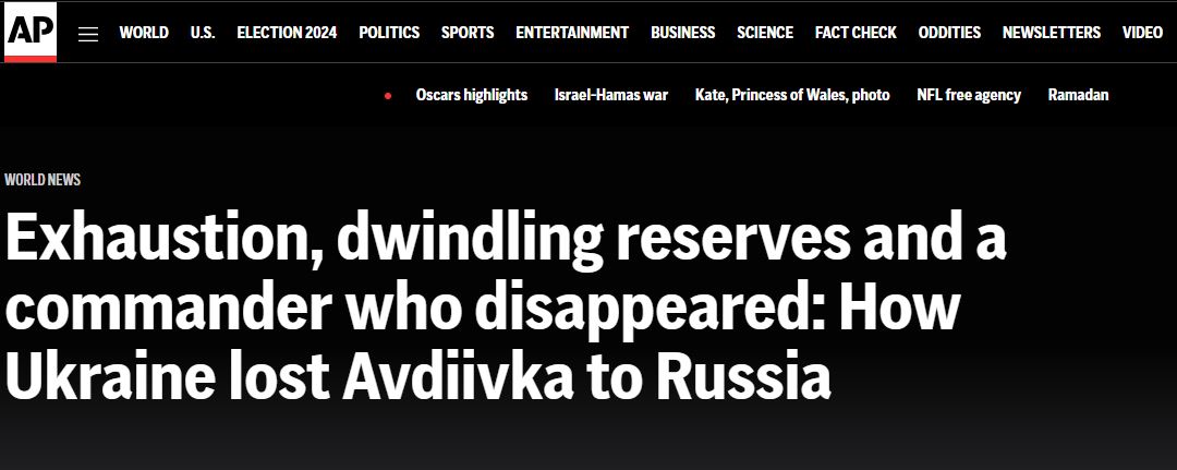 Нехватка боеприпасов, физическое и психологическое истощение солдат, плохое военное управление и численное превосходство российских войск – всё это, вместе взятое, и привело к падению хорошо укреплённого города Авдеевка, который находится под боком у Донецка и откуда все эти годы украинская армия могла бить по сепаратистам. Американское информационное агентство Associated Press именно так называет жителей Донбасса и разбирается в причинах, которые заставили ВСУ уйти из города-крепости, хотя украинская пресса много лет уверяла, что этот город взять невозможно, настолько он укреплён.