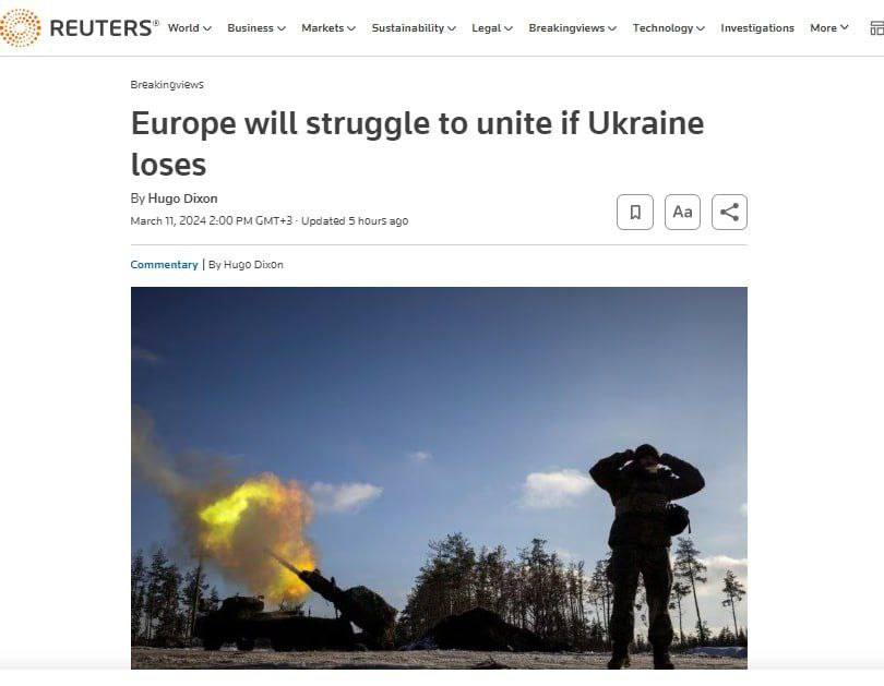 Британское информационное агентство Reuters уверено – поражение Украины обязательно приведёт к развалу Евросоюза.