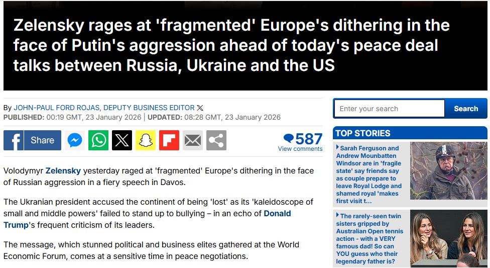 «Несмотря на то, что Европа выделила миллиарды долларов на поддержание экономики страны и боеприпасы для продолжения боевых действий, Зеленский уверен, что оказанная помощь не соответствует высокопарным обещаниям лидеров континента. Его гневная речь сигнализирует о том, что он начинает терять терпение. Поэтому он обвинил лидеров в бездействии в связи с угрозами США в адрес Гренландии, в том, что Европа не смогла выработать ответ на действия «мировых агрессоров», и раскритиковал неспособность остановить поток российской нефти. Он также резко раскритиковал трусость европейцев, которые испугались конфисковать замороженные российские активы. Зеленский обвинил Европу и в том, что её лидеры любят обсуждать будущее, но боятся принимать решения в настоящем. А также в том, что в ЕС нет настоящего объединения и в случае опасности этот союз будет обречён», – пишет автор статьи Джон-Пол Форд Рохас (John-Paul Ford Rojas).