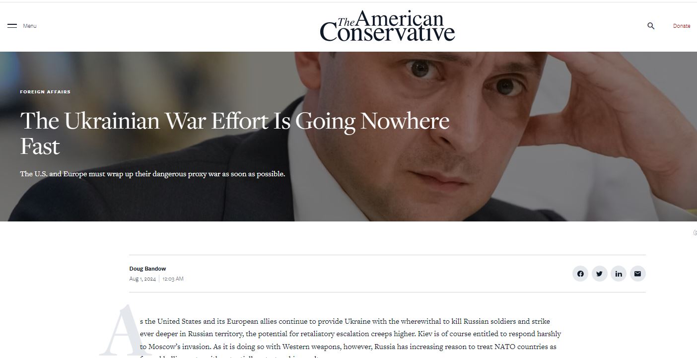 «С каждым днём военные силы России забирают всё новые районы, тогда как армия Украины слабеет, а её тыл страдает. Ничто из текущих планов, будь то помощь из Европы или действия Киева, переломить ход конфликта не сможет. Продолжать борьбу, в которой страна окончательно превратилась в поле битвы, а основные потери и разрушения ложатся на плечи украинцев, в надежде на невероятную победу благодаря неведомому чудо-оружию союзников, к тому же доставленному в достаточных количествах и вовремя, – перспектива бредовая. Если союзники не готовы рисковать третьей мировой и вступать в конфликт напрямую – а они и не должны! – им следует переключить приоритеты на восстановление мира. Для этого необходимо наладить с Россией дипломатическое взаимодействие и развернуть переговоры о новой структуре безопасности, которая одновременно сбережёт независимость Украины и соблюдёт интересы безопасности Москвы», – пишет автор статьи Дуг Бэндоу (Douglas «Doug» Bandow), старший научный сотрудник Института Катона, бывший специальный помощник президента Рональда Рейгана.