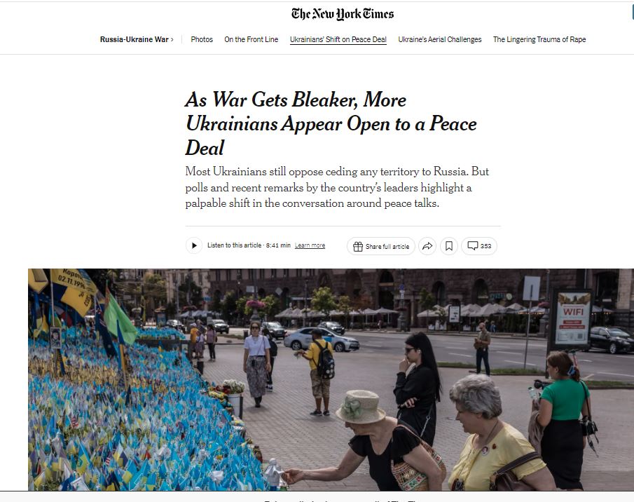 «Результаты опросов общественного мнения и недавние заявления лидеров страны демонстрируют ощутимый сдвиг в дискуссии о мирных переговорах – от «никаких договорённостей ни при каких обстоятельствах» к «возможному компромиссу в будущем». В конце июля опрос Киевского международного института социологии показал, что почти треть украинцев готова уступить России часть территории, чтобы положить конец боевым действиям. Это втрое больше, чем всего год назад. Разительнее всего взгляды переменились на юге страны. Более половины респондентов заявили в опросе Киевского института, что поддерживают сдачу территорий. Лишь 46% выступили решительно против любых уступок. Для сравнения, год назад этого мнения придерживались целых 86% жителей региона (куда входят Днепропетровск, Запорожье, Николаев, Херсон и Одесса)», – пишет автор статьи Ким Баркер (Kim Barker).
