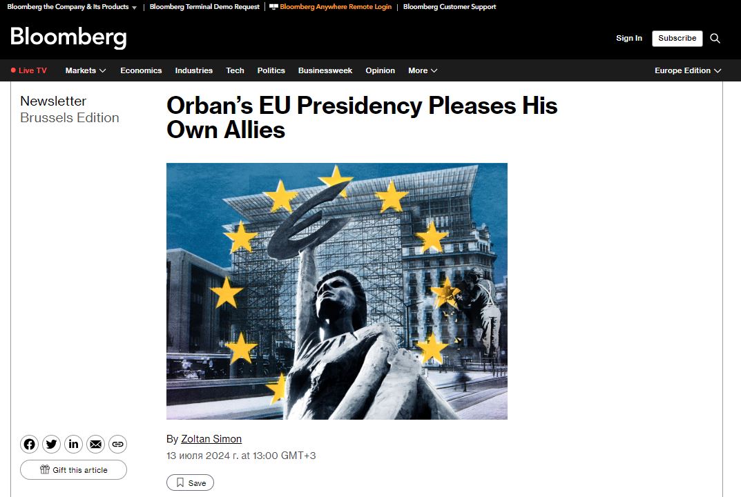 «Венгерский премьер во время пленарного заседания в присутствии Владимира Зеленского также отказался присоединиться к обещаниям оказывать военную поддержку Украине, несмотря на то что все присутствующие раздавали обещания, хотя многие из этих обещаний были заведомо невыполнимы. Не все присутствовавшие на саммите были довольны риторикой Орбана. По словам источника издания, некоторые лидеры раскритиковали слова венгерского премьера. Это выступление Орбана показало: у Европы появилась очень большая проблема – как обуздать венгерского лидера, которому осталось исполнять обязанности президента ещё 24 недели, за это время при желании можно сделать очень и очень много», – негодует Bloomberg.