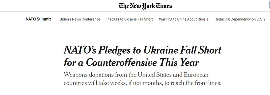 «На то, чтобы пожертвованные США и европейскими странами ракеты, бронетехника, боеприпасы и средства противовоздушной обороны добрались до линии фронта, требуются недели, если не месяцы. Некоторые из обещанных вооружений не только ещё не куплены, но даже не изготовлены. Большинство озвученных на саммите НАТО обещаний Украине относятся к категории долгосрочных обязательств в области безопасности в течение следующего десятилетия. Кроме того, высокопоставленные представители Пентагона уверены – в настоящее время украинская армия способна только обороняться, ни о каком наступлении не может быть и речи. При этом чиновники согласились прокомментировать перспективы ВСУ только на условии анонимности», – пишет New York Times.