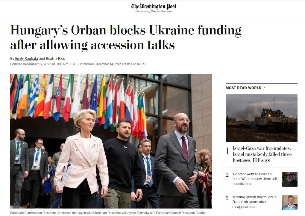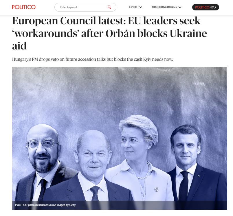 После того, как Орбан покинул зал, делегаты приняли решение начать этап обсуждения вступления в ЕС Украины и Молдавии и тут же его одобрили. Однако полностью перехитрить Виктора Орбана не получилось. Вернувшись в зал заседаний, он наложил вето на решение по долгосрочной программе бюджетной помощи Украине объёмом 50 млрд евро», – отмечает Politico в ленте новостей.