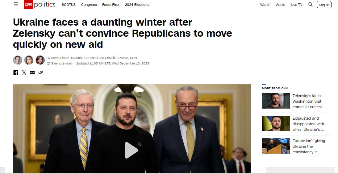 Не скрывает и американский телеканал CNN – после неудачной попытки Зеленского убедить республиканцев помочь деньгами Украину ожидает суровая зима.