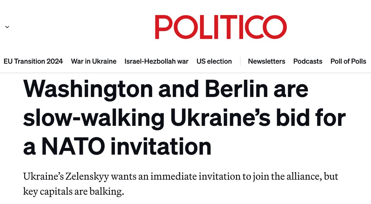 «По словам натовских чиновников, которые согласились поделиться результатами последних внутренних обсуждений на условиях анонимности, в число крупных держав, затягивающих ответ на призыв Зеленского немедленно принять Киев в альянс, входят Германия и США. Потому что