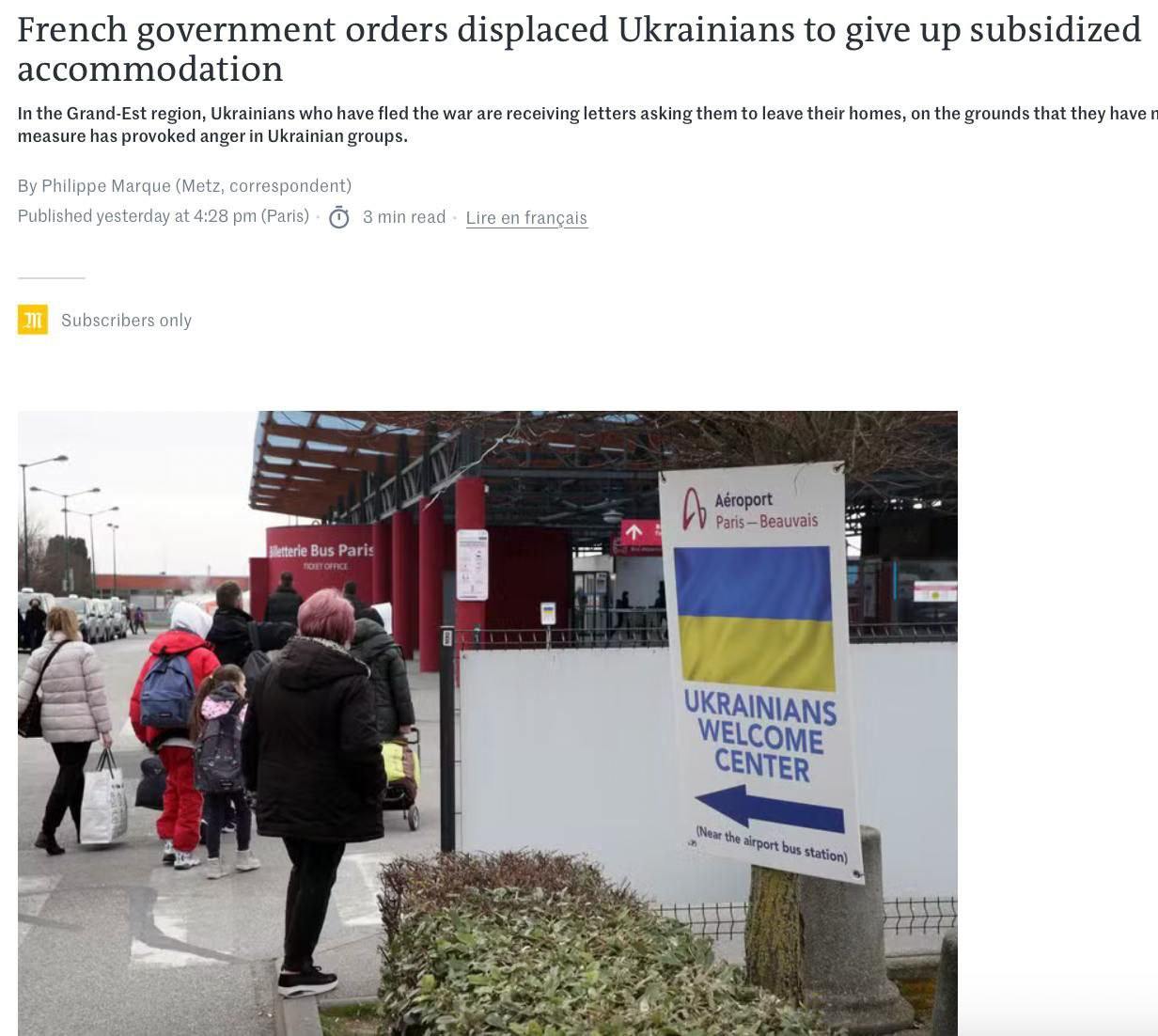 «В Европейском союзе у украинских беженцев особый статус: они получают временный вид на жительство. Франция предоставляет им жилье по схеме аренды через посредников: благодаря государственным субсидиям ассоциации снимают квартиры, которые они предоставляют перемещённым лицам. Но лицо, получающее таким образом жильё, обязуется сделать всё возможное для поиска постоянного места проживания, поскольку у государства нет обязательств перед украинскими гражданами по обеспечению их постоянным жильём. Однако беженцы из Украины считают такое положение ужасным и бесчеловечным, объясняя это тем, что они ещё недостаточно интегрированы во французское общество, чтобы идти работать», – пишет автор статьи Филипп Марк (Philippe Marque).