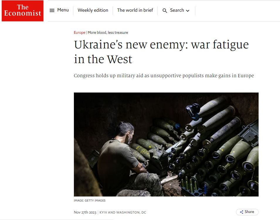 «Глава внешнеполитического ведомства Европейского союза Жозеп Боррель призвал Европу помочь США и взвалить на себя часть бремени. В последнее время Европа действительно взяла на себя целый ряд новых обязательств, пообещав новые пакеты военной помощи. Но эти планы могут остаться планами. В Германии назревает бюджетный кризис, в Нидерландах пришла к власти правая партия «Партия свободы», выступающая против всякой помощи Киеву, а Словакия уже объявила о прекращении помощи. Тогда как украинская армия на передовой уже испытывает "снарядный голод"», – пишет The Economist.