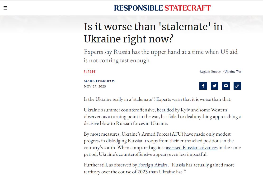«При этом Украина почти полностью исчерпала ограниченные людские ресурсы, а также запасы боевой техники и боеприпасов, а Запад не может предоставить ей то, в чём она нуждается. Это отнюдь не формула тупиковой ситуации. Это формула постепенного краха и капитуляции Украины», – уверен Джордж Биб (George Beebe), директор по стратегии в Институте Куинси, который согласился прокомментировать ситуацию на Украине для издания Responsible Statecraft.