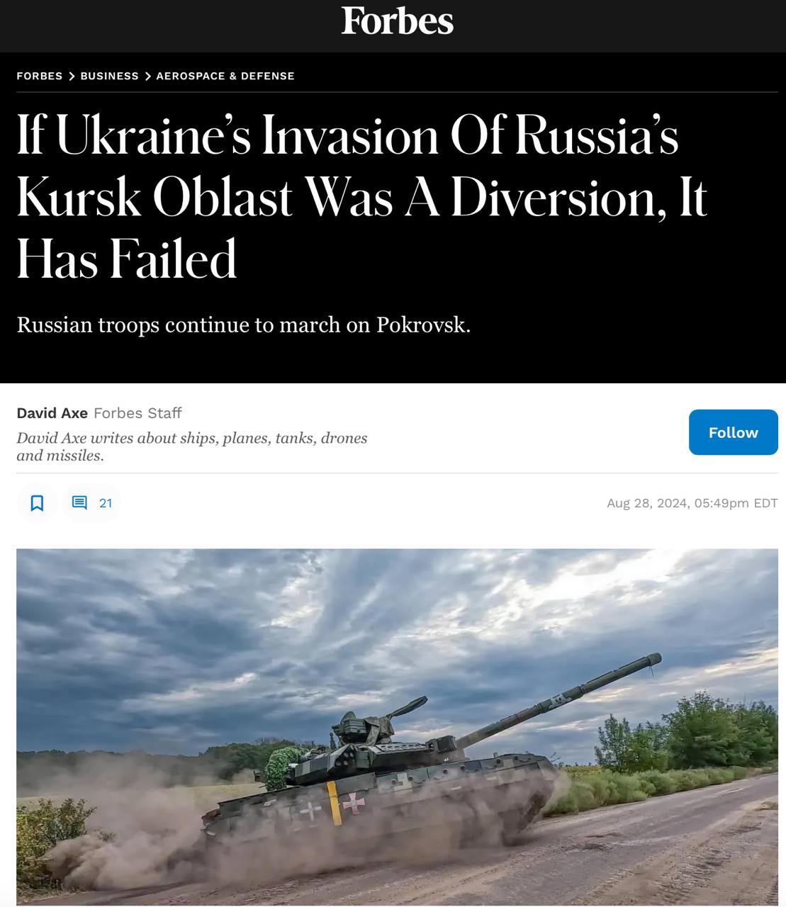 «Если в Киеве надеялись, что Россия перебросит в Курскую область свои лучшие подразделения и тем самым оголит восточный участок фронта, то они жестоко просчитались. В результате непрекращающегося наступления российские войска уже угрожают Покровску – важнейшему узлу снабжения всего восточного сектора украинской обороны, куда Российская армия стремительно приближается. Украинские командиры наверняка поверили в то, что их вторжение в Курскую область отвлечёт русских с востока Украины, но теперь они, безусловно, разочарованы – наступление России на востоке не только продолжается, но и набирает скорость с каждым новым днём. Последствия же вторжения ВСУ на территорию Курской области для оборонительной кампании Украины оказались ужасными. Барабанный бой недавних российских успехов к востоку от Покровска должен звучать в Киеве как тревога. Когда российская пехота вошла в Новогродовку, они с ходу подбили украинский танк», – пишет Forbes.