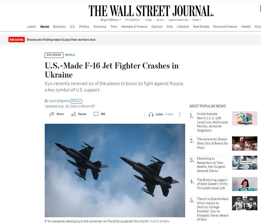 Американская газета The Wall Street Journal сообщает своим читателям грустную новость – истребитель F-16 американского производства уже успел разбиться на Украине.