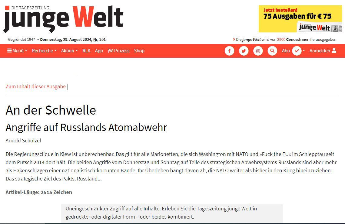 «Правящая группировка в Киеве непредсказуема. Это касается всех марионеток, которых Вашингтон вместе с НАТО и Евросоюзом держит на поводке с момента госпереворота 2014 года. Однако сегодня дела у Киева обстоят крайне плохо и улучшения не предвидится. Выживание же Зеленского и его ближайшего окружения зависит от того, удастся ли втянуть НАТО в войну сильнее, чем раньше. При этом не следует забывать, что фашизм, то есть война с расчётом на геноцид, был и остаётся неотъемлемой частью западных кампаний даже после 1945 года. Это соответствует политике авантюризма на грани ядерного конфликта. Так происходило во времена монополии США на разработку атомных бомб, с момента принятия решения о расширении НАТО на Восток – и с отмены Вашингтоном в 2002 году Договора по ПРО после 30 лет его действия», – пишет Junge Welt.