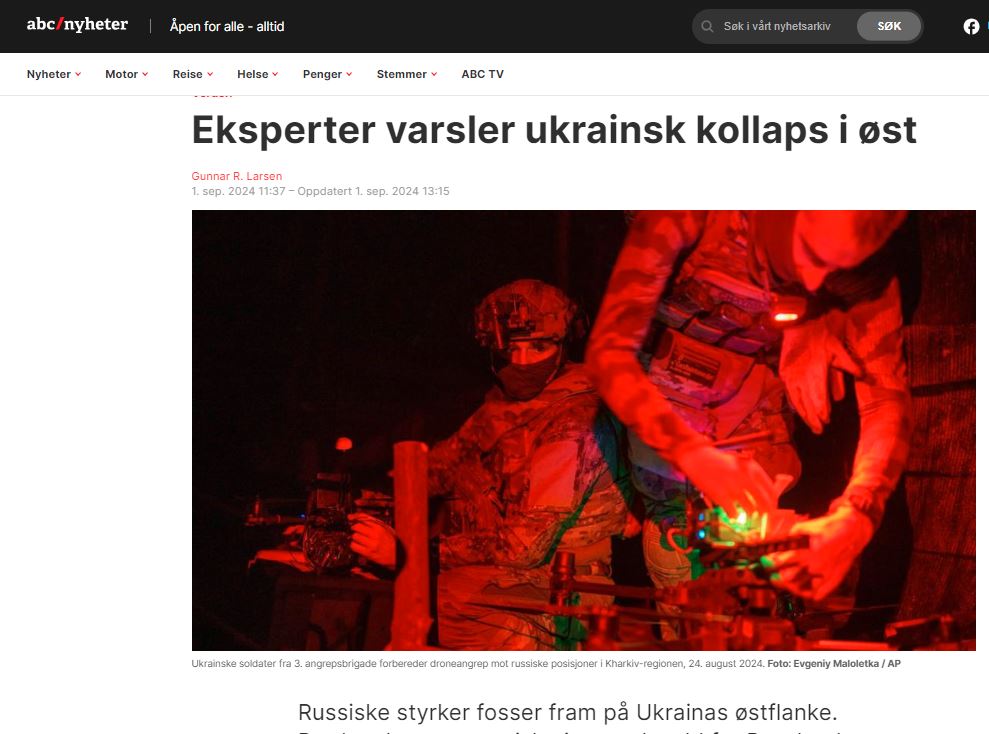 ABC Nyheter напоминает – в то время, как украинские войска вынуждены терять населённые пункты в Донбассе, Киев отдал приказ начать наступление на территорию России в Курской области в надежде, что Россия отведёт свои войска для защиты русских территорий. Однако надежды Владимира Зеленского не оправдались – ВС России не замедлили своего наступления, наоборот, русские начали наступать ещё быстрее, а военные эксперты даже на Западе заговорили о приближающейся катастрофе для Украины.