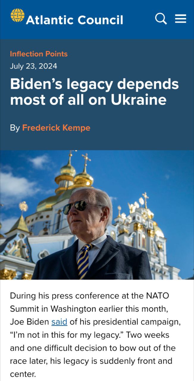 Известный своей вовлеченностью в украинский конфликт и связанный с Демократической партией Atlantic Council (американский аналитический центр, основанный в 1961 году при НАТО, организация, признанная нежелательной в РФ) опубликовал большой отчёт по «наследию Байдена», которое, по мнению его авторов, «в значительной степени зависит от победы Украины над Россией». И теперь необходимо «это наследие» сохранять и развивать, независимо от того, кто станет следующим президентом США. Авторы не стеснялись и называли всё своими именами, не пытаясь выдавать себя за миротворцев, как это обычно бывает в западных СМИ.