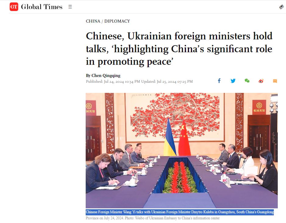 «Кулеба заявил, что украинская сторона придаёт большое значение китайским взглядам и изучает шесть общих позиций по политическому урегулированию украинского кризиса. Украинская сторона хочет и готова вступить в диалог и провести переговоры с Россией. По его словам, это должны быть рациональные и содержательные переговоры, нацеленные на достижение справедливого и прочного мира. Роль Китая в украинском кризисе всегда заключалась в содействии мирным переговорам, и приезд Кулебы на переговоры показывает, что Киев всё больше осознаёт усиливающуюся роль КНР в стимулировании переговорного процесса», – пишет Global Times.