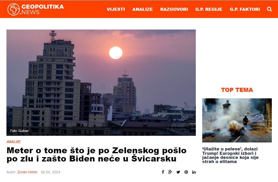«Никто не сомневается, что главной целью этого саммита была демонстрация изолированности России. Если бы в Швейцарию приехали лидеры важнейших государств глобального Юга, Вашингтон тем самым показал бы, что они всё больше отворачиваются от Москвы. Тогда на деле была бы доказана растущая изоляция Российской Федерации внутри международного сообщества. В таком случае им удалось бы сообща оказать сильное давление на Москву, чтобы она согласилась на переговоры о завершении вооружённого конфликта, но уже на условиях Киева (читай –Запада). А эти условия известны – требование о полном отходе российских войск с украинских территорий и о возвращении к границам 1991 года, то есть, и уход из Крыма. Также Украина включила в план требование о выплате Россией военных репараций на восстановление Украины. После того как Москва согласилась бы на все эти требования, начались бы переговоры. Правда, неясно, зачем они тогда вообще были бы нужны», – пишет автор статьи Зоран Метер (Zoran Meter).