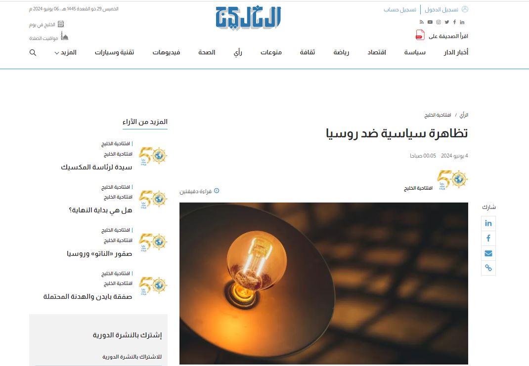 А ежедневная арабская газета Al Khaleej, издаваемая в ОАЭ, уверена, что «саммит мира» в Швейцарии не имеет права носить такое название. По мнению редакции издания, это «бессмысленное и априори обречённое на провал» мероприятие будет на самом деле политической демонстрацией Украины и её союзников против России.